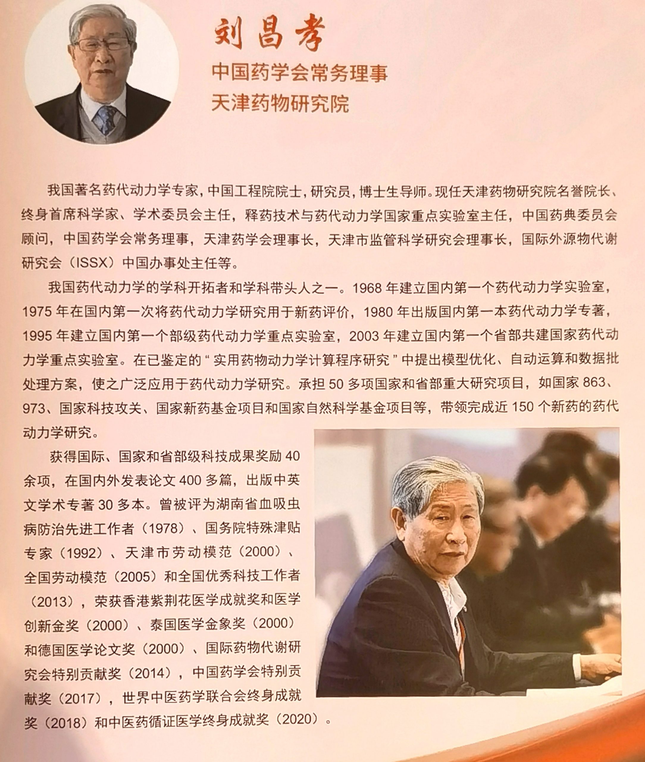 天津药物研究院刘昌孝院士荣获中国药学会“最美科技工作者”荣誉称号作者: zhang, zhiyao / 2021年9月22日 为进一步弘扬中国科学家精神,激发广大科技工作者的荣誉感、自豪感、责任感,今年4月,在中共中央宣传部、中国科学技术协会、中国科学院、中国工程院和国防科技工业局统一布署下,中国药学会组织开展了“最美科技工作者”评选工作。经过长时间、多渠道、广泛细致的评选评选,最终我院刘昌孝院士等全国10位优秀科研工作者获此殊荣,并于9月18日在杭州举行的2021年中国药学大会上进行了表彰颁奖。 刘昌孝院士是我国著名药代动力学专家,现任天津药物研究院名誉院长、终身首席科学家、学术委员会主任,释药技术与药代动力学国家重点实验室主任,中国药典委员会顾问,中国药学会常务理事。刘院士从事药代动力学研究50多年,建立了国内第一个药代动力学实验室,第一次将药代动力学研究用于新药评价,出版了国内第一本药代动力学专著,建立了国内第一个部级药代动力学重点实验室和第一个国家药代动力学重点实验室;承担50多项国家和省部重大研究项目,带领完成近150个新药的药代动力学研究,获得国际、国家和省部级科技成果奖励50余项,在国内外发表论文480多篇,出版中英文学术专著38本。刘院士兢兢业业,治学严谨,不断开拓创新,首次提出了“中药质量标志物”的重要理论,并开展了大量研究,在全国范围内掀起了中药质量研究的热潮,为中药质量标准化研究指明了方向,对中药现代化具有重要推动作用,为我国医药事业做出了突出贡献,不仅彰显了当代中国科学家精神,同时也为广大科技工作者树立了楷模和榜样。