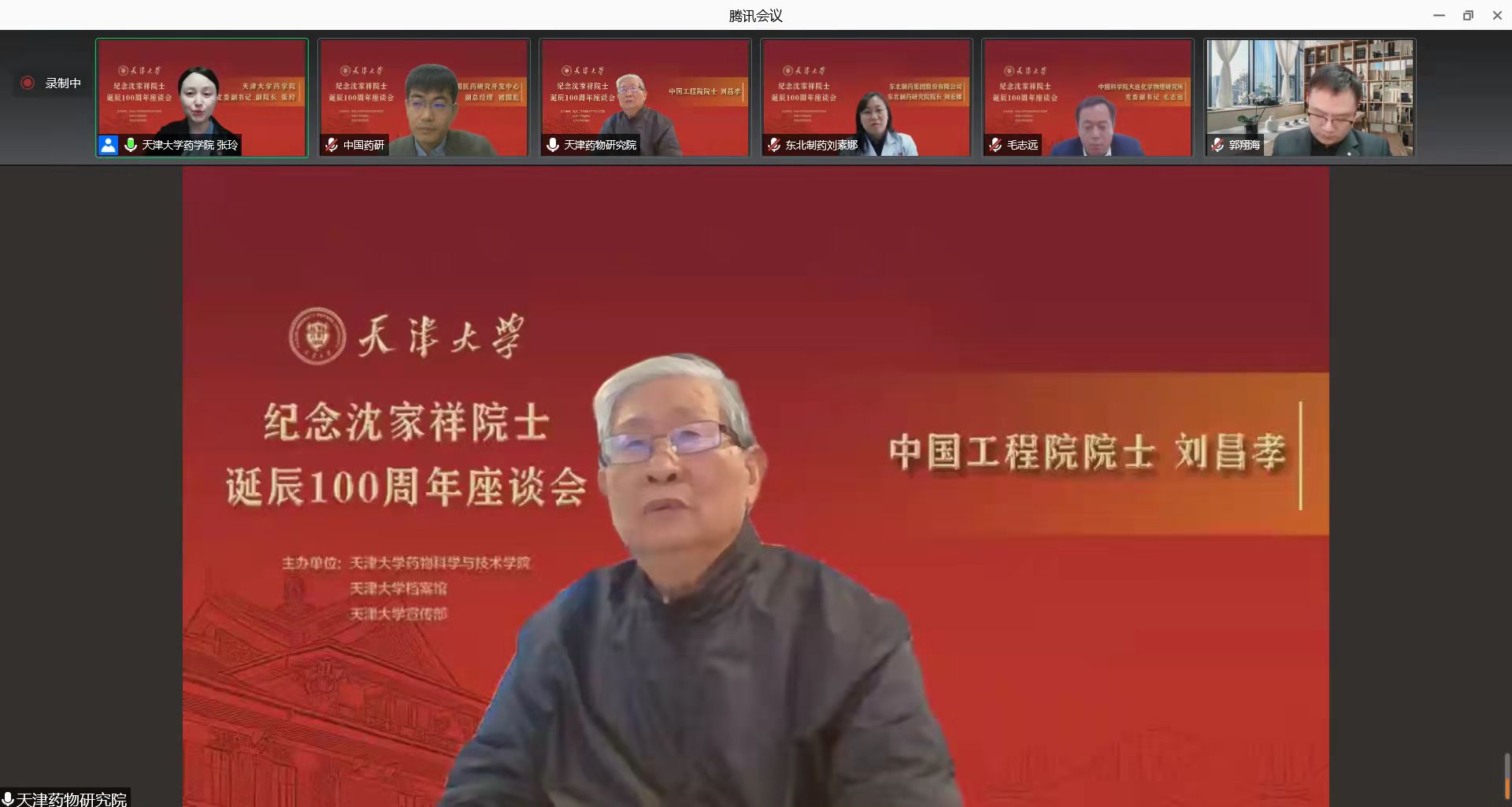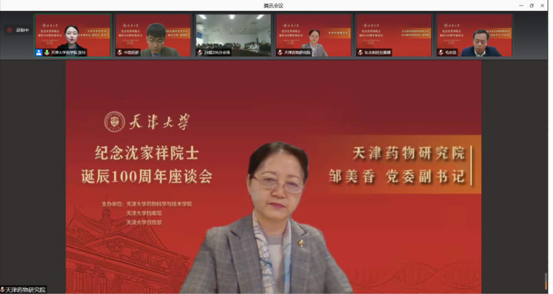 今年是沈家祥院士诞辰100周年,11月11日,天津大学召开了“纪念沈家祥院士诞辰100周年座谈会”,邀请沈家祥院士生前学习工作单位的代表和亲属好友学生代表回顾了他为新中国医药事业奋斗的一生。天津药物研究院受邀参加座谈会,线上分会场设在五楼昌孝图书馆,院党委副书记邹美香代表天津药物研究院发言,刘昌孝院士作为沈家祥院士老同事发言。