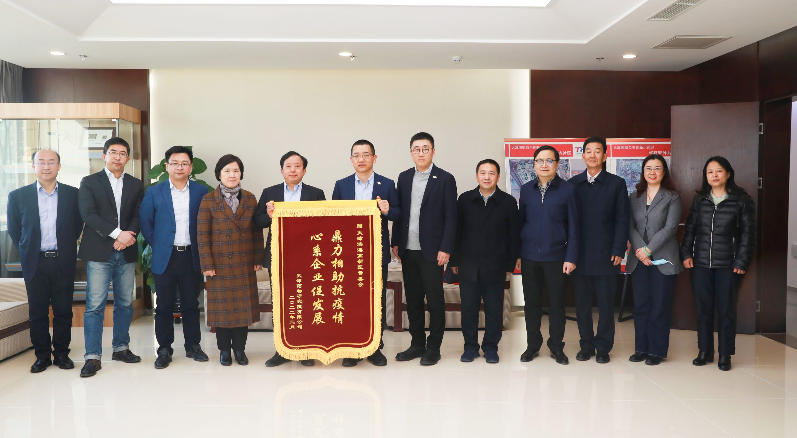 天津药物研究院经营层拜访高新区管委会作者: zhang, zhiyao / 2022年3月8日 3月2日,天津药物研究院总经理黄长江率天津药物研究院(以下简称“药研院”)全体经营层拜访滨海高新区管委会,得到高新区党委书记、管委会主任夏青林,党委副书记张晨光,管委会副主任龙苗、韩林的热情接待。 黄长江向高新区管委会一直以来对药研院给予的大力支持表示诚挚的感谢。黄长江表示,药研院自2002年落户滨海高新区以来,受到了高新区管委会各届领导的关怀与支持,高新区也见证了药研院的发展变迁,特别是药研院落户渤龙湖片区后,对企业开展“双万双服”,推出企业服务专员制度,不仅提供政策指导,还千方百计帮助企业解决实际困难,让药研院感受到了家人般的支持。在高新区渤龙湖片区生物医药产业的聚集效应下,药研院也走上了发展的快车道。黄长江代表药研院向高新区赠送了“鼎力相助抗疫情 心系企业促发展”的锦旗,向高新区在药研院疫情防控、复工复产中给予的有力指导和全力支持表示感谢。 夏青林书记对药研院一年来在项目建设、产品研发、科学研究等一系列工作取得的成绩给予充分肯定。他强调,高新区将全力支持药研院发展,把精准服务贯彻于企业发展始终。药研院作为高新区乃至天津市生物医药产业的硬核支撑,要充分发挥龙头带动作用,以药物研发、制剂、分析等技术力量优势带动产业聚焦,不断聚拢上下游优质企业向高新区汇聚。 夏青林书记希望药研院充分发挥招商局体制机制和自身医药研发的优势,不断提高自主创新能力,将科研力量的强大势能转化为高质量发展动能,为高新区创新要素聚集、全力建设京津冀特色“细胞谷”做出更大贡献。 黄长江表示,药研院未来将坚持以“科技兴药 惠福人类”为使命,以建成“世界有影响力、中国一流的研发型制药企业”为目标,持续加强创新驱动,不断实现企业发展的新跨越和新突破,为高新区生物医药产业发展做出贡献。