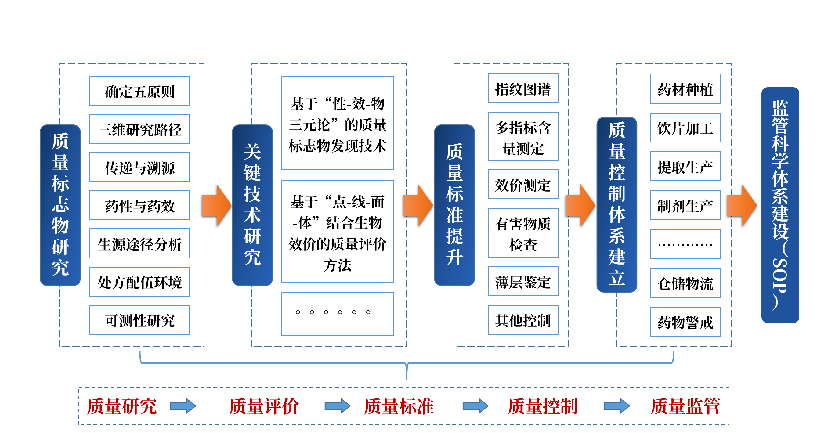 中药质量标志物专题系列报道(一)作者: zhang, zhiyao / 2022年4月28日 2022年4月11日,天津市科学技术奖励大会在天津礼堂召开。由天津药物研究院作为第一完成单位、刘昌孝院士领衔完成的《中药质量标志物理论创建与关键技术创新及其应用》项目,成功摘得2021年度天津市科学技术进步一等奖。近期,天津电视台、津云、滨海时报等多家媒体平台对该项目进行了专题报道,在社会上和行业内引起了广泛关注和积极反响。为了更好地向社会大众讲解和宣传中药质量标志物的科学内涵和重要价值,“天津药物研究院”公众号特推出中药质量标志物专题系列报道。 中药质量标志物专题系列报道之一 中药质量标志物的提出背景和科学内涵 中药质量是中药临床疗效的保障,是中药产业发展的生命线。中药质量研究和质量标准的建立是一项复杂的系统工程,历来是行业关注的焦点,也是关系到中医药科学和产业发展的国家战略问题。为促进中医药产业健康发展,完善质量标准体系,健全以《中国药典》为核心的国家药品标准体系,提升中药及产品质量标准,刘昌孝院士针对中药生物属性、制造过程及配伍理论等自身医药体系的特点,于2016年创造性地提出中药质量标志物(quality marker,简称Q-Marker)的新概念。中药Q-Marker概念提出后,引起学术界、产业界的积极响应和广泛认同,并纷纷在质量标志物核心概念统领下开展相关研究。 影响中药质量的十大因素 中药Q-Marker是指存在于中药材和中药产品中固有或加工制备过程中形成的、与中药功能密切相关的化学物质,又可以进行定性鉴别和定量测定,按中医配伍组方的君药为先原则,兼顾臣佐使药的代表性物质。Q-Marker的核心内容基于特有性、可测性、有效性、传递性和中医药理论关联性的“五要素”,既反映了与有效性(和安全性)的关联关系,又体现了中药成分的专属性、差异性特征,特别是基于方-证对应的配伍环境,使质量研究回归到中医药理论,体现针对疾病的中药有效性表达方式及其物质基础的客观实质。Q-Marker核心概念有利于反映中药治疗疾病的本质特征;有利于建立专属性、针对性的质量评价方法和质量标准;着眼于中药材、生产、体内全过程的特有、差异、动态变化和质量的传递性、溯源性,有利于建立可传递和溯源的全程质量控制体系。 基于“五原则”的复方中药质量标志物发现的研究路径 与以往质量研究思路不同,Q-Marker概念的重要意义在于聚焦中药质量属性的本质特征以及质量评价与质量控制的最终目的,既是中药质量的核心概念,又是中药产业的核心概念。基于中药Q-Marker的发现与确认,有利于对中药质量进行科学评价,建立整体质量标准和基于中药全产业链质量控制体系,并为中药行业监管的重要抓手和依据。 中药质量标志物的研究意义和应用价值 自2016年刘院士提出Q-Marker概念,我院科研工作者对此进行了大量的研究工作,迄今已形成中药质量标志物核心理论,出版首部中药质量标志物理论专著《中药质量标志物理论与实践》;在《Phytomedicine》、《RSC Adv.》、《J. Chromatogr. B》、《J. Pharm.Biomed. Anal.》、《中草药》、《药学学报》等重要刊物发表研究论文200余篇;被国家自然科学基金委员会批准将“中药Q-Marker”列为国家基金委的重点项目;组建了我国首个中药质量标志物研究平台——天津市中药质量标志物重点实验室;《中药质量标志物理论创建与关键技术创新及其应用》项目荣获2021年度天津市科学技术进步一等奖。 该理论的提出实现中药质量研究的实质性突破,所建立的原则、方法和研究模式被全国相关研究所参照,发挥了引领中药质量研究的作用。中药Q-Marker为提升中药及其产品质量标准、健全国家药品标准体系、推进中医药的国际化和标准化进程,促进中医药产业健康发展产生积极意义。 后续我们围绕Q-Marker在中药新药研发、药材、饮片质量标准、中药二次开发、中成药生产全过程质量控制以及中药监管科学等领域的重要应用,在系列报道中进行逐一阐述。 主要参考文献[1] 刘昌孝,陈士林,肖小河,等. 中药质量标志物(Q-Marker):中药产品质量控制的新概念[J]. 中草药,2016,47(9):1443-1457.[2] 刘昌孝. 中药质量标志物(Q-Marker)研究发展的5年回顾[J]. 中草药,2021,52(9):2511-2518.[3] 张铁军,白钢,陈常青,等. 基于“五原则”的复方中药质量标志物(Q-marker)研究路径[J]. 中草药,2018,49(1):1-13.[4] 张铁军,白钢,刘昌孝. 中药质量标志物的概念、核心理论与研究方法[J]. 药学学报,2019,54(2):187-196.