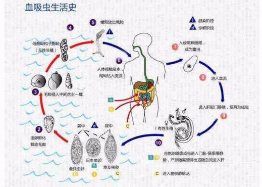 血吸虫病是一种寄生虫病,血吸虫繁殖发育的复杂生命周期中,钉螺是重要的寄生体,虫卵在水中发育成毛蚴,在钉螺里进行无性繁殖形成尾蚴释放到疫水中,进入人体和动物(如牛)体的血液中,形成成虫并开始雌雄合抱,进行有性繁殖和产卵,卵再由粪便排出体外的疫水,再进入下一个发育周期。