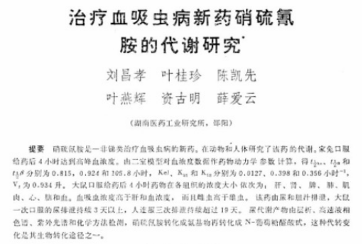 1969年12月化学工业部北京医药工业研究院(天津药物研究院有限公司前身单位之一)战备搬迁到湖南邵阳,更名为湖南医药工业研究所,由在北京时的总参军管改为由广州军区军管。该所在1974年接受了中共湖南省委血防办下达的科研任务,立即开展血吸虫病治疗药物的研究。湖南和湖北两省的医药工业研究所几乎同时开展了同一个新药硝硫氰胺的化学合成和广谱抗血吸虫病药物实验和临床治疗效果的研究。两所于1975年完成合成研究(新药代号“7505”)。湖南医药工业研究所安排徐嘉彦的团队进行化学合成和制剂研究,安排刘昌孝的药理和药物代谢动力学研究团队在湖南邵阳开展临床前研究,并与湖南省血吸虫病防治研究所在湖南岳阳的疫区进行病人治疗,还参与湖北的协作研究工作。经过近三年的努力研究,临床用于治疗血吸虫病,获得很好的效果。药代动力学研究由我国首个院所建立的药代动力学实验室承担,是国内首个应用药物代谢动力学进行新药评价的项目,研究发现在消化道吸收较快,口服后2小时肝、血浓度达高峰,该药在组织中浓度不大。生物利用度不很高,口服后60%未被吸收而从粪中排出,药物吸收后由尿及胆汁排泄,部分在肠道重吸收,肝肠循环有的可达10余次。若连续多次给药,有可能出现积蓄。所以初步建议临床用药是每天一次,最多连续用药三天,但采用多少剂量能达到有效地杀灭血吸虫成虫及虫卵,需要更多的治疗机制的研究才能大面积推广应用。