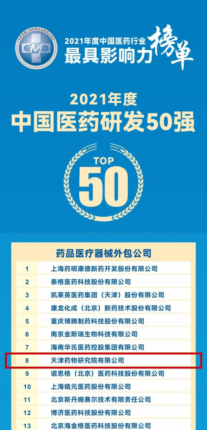 喜报|天津药物研究院入选 “2021年度中国医药研发50强”榜单作者: zhang, zhiyao / 2022年12月12日 近日,中国全国工商联医药业商会发布了2021年度中国医药行业最具影响力榜单,天津药物研究院(以下简称“药研院”)入选“2021年度中国医药研发50强”榜单。药研院下属天诚新药评价公司入选“2021年度中国医药自主创新先锋企业”榜单。 天津药物研究院是招商局集团旗下现代研发型制药企业,拥有60多年的药物研发历史,一直以来坚持科技创新,着力打造创新药研发、CXO技术服务和生产销售三大核心业务板块。技术服务方面,药研院致力于成为技术驱动型的CXO一站式综合服务商,为行业提供包括化学药、中药和细胞药物的从药物临床前研发直到生产上市所需的定制研发和生产服务。 天津药物研究院对外服务业务——技术驱动型的CXO一站式综合服务商 化学药CDMO:深厚的技术沉淀,规范的质量体系,全方位保障服务能力 药研院拥有一系列国家和地方的重点实验室、工程技术中心、服务平台,形成了完善的药品研发产业链,具备开展创新药、仿制药、改良制剂的研发实力,具有良好的成药性评价服务能力,具有多个研发技术平台、两个符合cGMP质量体系的原料药生产基地和一个符合GMP质量体系的制剂生产基地,可提供从临床前研发直到药品上市的全生命周期所需的化学原料药、制剂的定制研发和生产服务。我们始终以客户为中心,依托深厚的研发积淀,利用高度市场化的机制,采取灵活多样的合作模式,多种方式合作,持续为合作伙伴创造价值,实现互利共赢。天津药物研究院CXO业务之化学篇——技术驱动的CDMO一站式服务 中药CRO:中药质量标志物研究的先行者,致力于中药新药研发及大品种二次开发 药研院拥有60余年的中药研发历史,是国内中药新药研发最具实力的机构之一,多年来秉承“传承精华、守正创新”的发展理念,一直致力于中药新药研发和中药二次开发等核心业务。自主研发并获得新药证书41项,包括我国第一个滴丸和软胶囊制剂的中药品种,首创品种39个,独家品种33个。涉及23个病种,其中桂枝茯苓胶囊、小儿豉翘清热颗粒、三七通舒胶囊等8个代表性品种累计销售额超过300亿元,近3年直接经济效益超过100亿元。2010年至今已为50余家中药企业完成临床前研究100余项,协助企业获得新药临床批件21项,获得新药证书3项。天津药物研究院CXO业务之中药篇 ——以“中药核心价值”贯穿的一站式服务 细胞药物CXO:为细胞研发、生产、临床应用等环节提供全面的第三方服务 药研院在完成抗体药物、干细胞产品等生物技术药物非临床评价的基础上,进一步扩展对细胞和基因治疗产品的服务能力,投资组建了天津和创生物技术有限公司(以下简称:和创生物),专注于细胞及基因治疗(CGT)等新技术产品研发、生产委托(CDMO)服务、细胞产品质量检测服务、药物筛选与评价服务及高端健康管理服务。依托和创生物为载体,药研院与中国医学科学院血液病医院(血液学研究所)全面战略合作努力创建国际一流、国内顶尖的细胞、生物技术服务平台。天津药物研究院CXO业务之细胞及基因治疗产品篇——技术驱动的一站式服务 (qq.com) 新药评价CRO:国内知名、行业领先的药物评价整体解决方案供应商 天津天诚新药评价有限公司是药研院的全资子公司,专注于药物临床前研究服务,汇集创新药物药效学、药代动力学、毒理学三大国家级技术平台,拥有国家药品监督管理局GLP九项认证和国际AAALAC认证等资质,累计服务国内外300余家企业,与近50家科研院校开展了合作,帮助取得100多个临床批件,其中包括多个中美双报项目。除药品评价外,还完成过如:特医食品、保健品、动物药物、医疗器械及化妆品等多个相关领域产品的研发服务。 拥有10年+国产品种注册经验,完成美国、日本制剂产品国内临床及上市注册,原料药和参比制剂一次性进口注册,化药创新药中美双报,40+CMC、临床前研究项目的方案评估、总结报告审核(化学药、中药、细胞药物等)。天津药物研究院CXO业务之新药临床前评价篇–以推进临床应用为目标的CRO一站式服务
