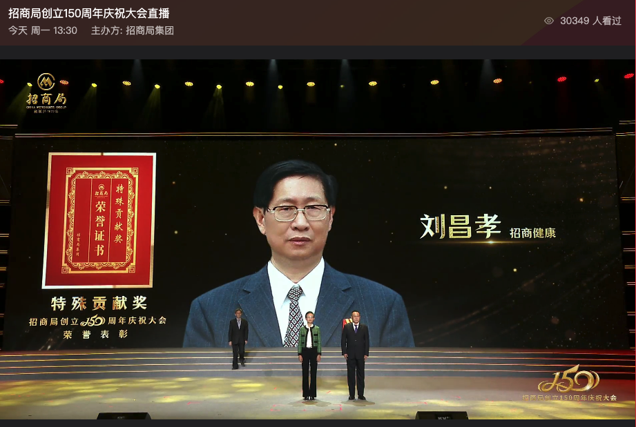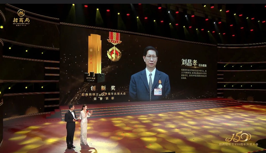 12月26日,招商局创立150周年庆祝大会在深圳国际会展中心隆重举行。大会上,在各个岗位、各条战线上为招商局作出重大贡献或长期服务招商局的代表分别获颁“功勋奖”“功臣奖”“领航奖”“先锋奖”“精锐奖”“特殊贡献奖”“创新奖”“感动招商奖”和“丹心奖”等奖项。集团董事长缪建民、总经理胡建华、党委副书记王宏等集团领导分别给获奖者颁奖。在荣誉表彰颁奖仪式中,中国工程院院士、天津药物研究院名誉院长、终身首席科学家刘昌孝院士荣获“创新先进个人一等奖”及“特殊贡献奖”两大奖项。