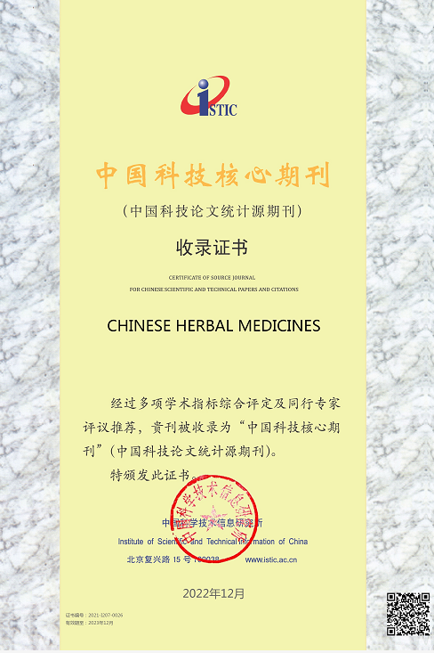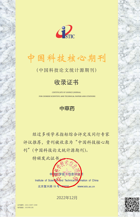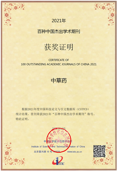2022年12月29日,2022年度中国科技论文统计报告正式发布:《中草药》杂志荣获2021年“百种中国杰出学术期刊”称号。