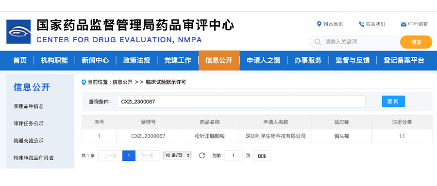 近日,由天津药物研究院承担临床前系统研究的1.1类中药新药“松针正脑颗粒”获批NMPA临床试验许可。